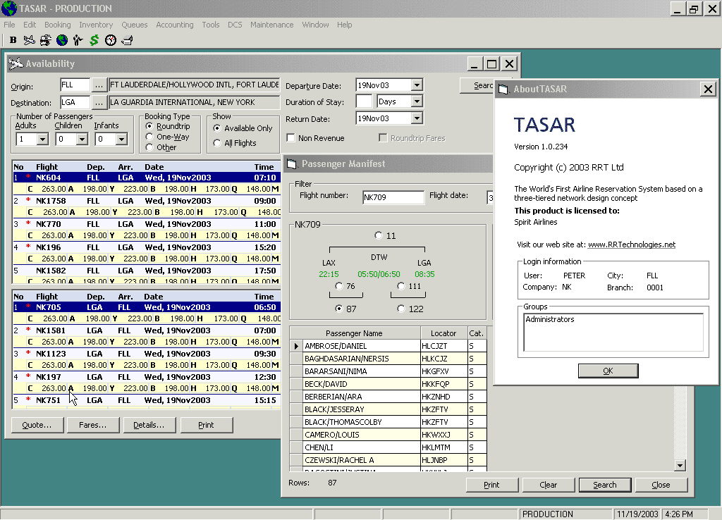 The application is based on a client/server model using personal computers with Windows as a user front-end and a UNIX database engine for the main business logic and data repository. The system distributes the processing workload on a networked array of processors. It provides customizable interfaces to external reservation systems.