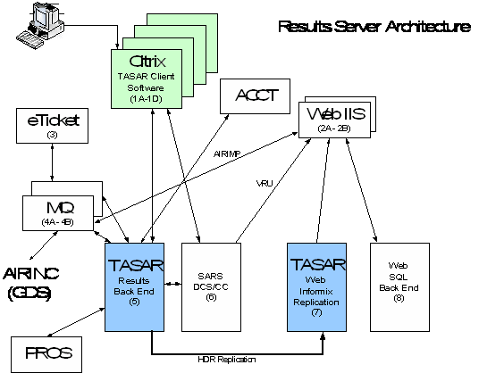 Results system topology consists of a central site Local Area Network with dedicated file, application, communication and database services. Wide Area Network bridges connect remote agents to the central site. Host gateways enable the connectivity to the distribution systems (CRS/GDS) or SITA/ARINC messaging services.